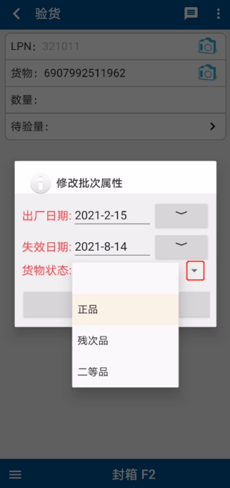 ③ 在【出厂日期】处,输入货品生产日期(或者在【失效日期】处输入失效日期)。在【货物状态】处,选择对应的货品状态,如【正品】、【残次品】、【二等品】等,点击【确认】,系统返回【验货】界面(图1.3.11)。