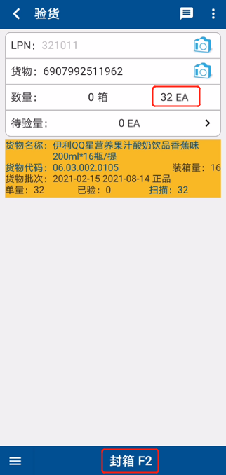 ④ 收货组员开始清点实物数量。在【EA】处输入散件数量,继续重复2至4步操作将剩余SKU分别验货,直至所有货品验货完成,点击【封箱F2】,系统提示【验货完成】,此单收货作业完成(图1.3.12、图1.3.13)。