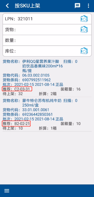 ③ After the shelving team members transfer the bulk goods to the target inventory location with a forklift, they scan the barcode of the goods at the [Goods], and the system prompts the SKU to be put on the shelf quantity and the storage location to be put on the shelf (Figure 1.4.13, Figure 1.4.14).