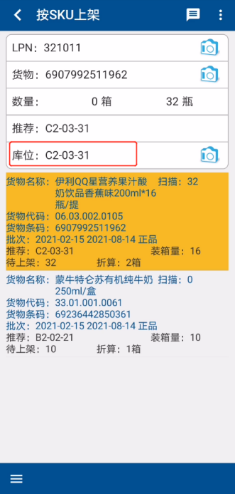 4.作业开始:上架组员复核收货明细,将货品运送并上架至对应库位,清点实物数量,并在EA处输入散件数量,扫描库位条码,完成【WMS】系统操作。