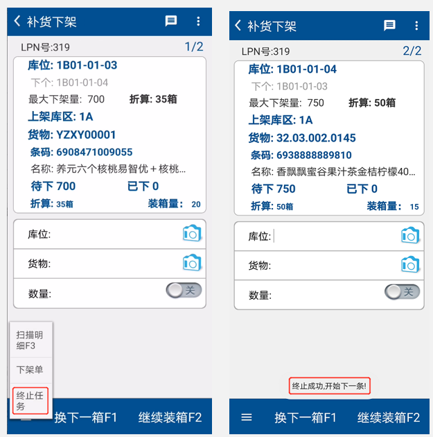 ② After confirming the storage location, scan the LPN code on the transit container, accurately find the specified quantity of goods on the storage location and load them into the container to complete the replenishment and removal operation. (Figure 3.2.6)